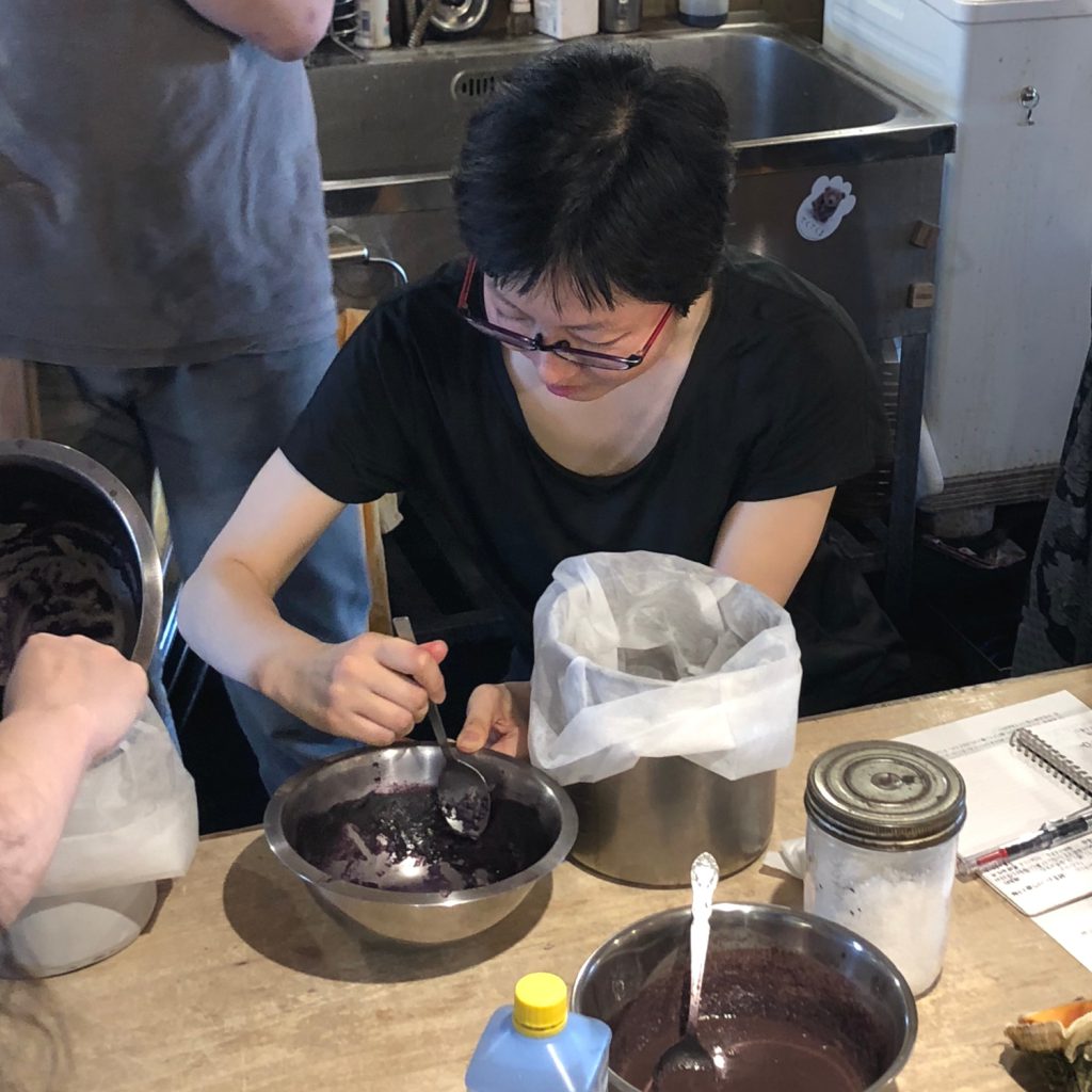 紫色になったプルプラをこそぎ落として全て不織布に入れて鍋に入れます。