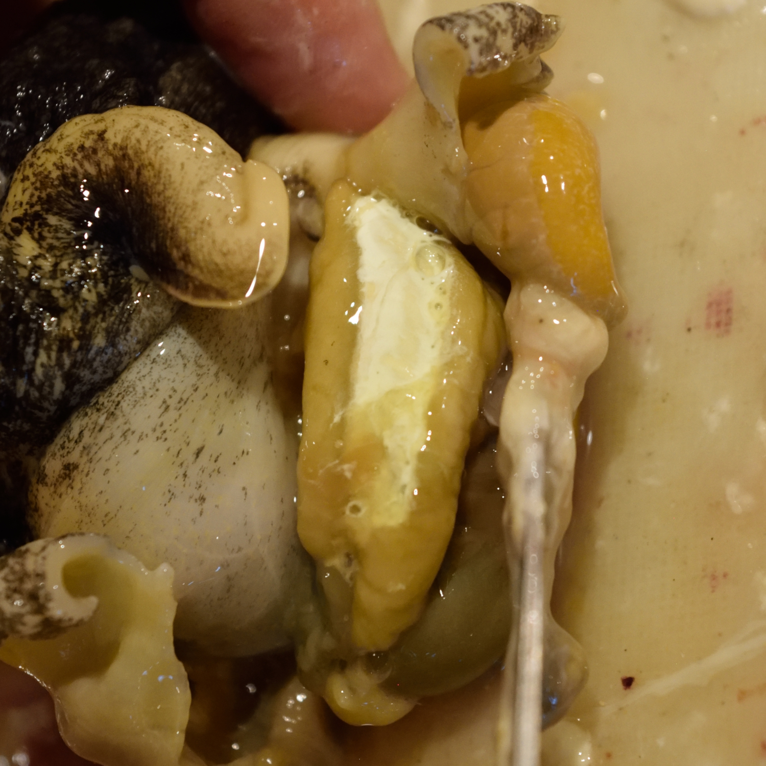 アカニシからうまいこと身を取り出して、「プルプラ」と言われるクリーム色の部分だけを切り取り集めます。