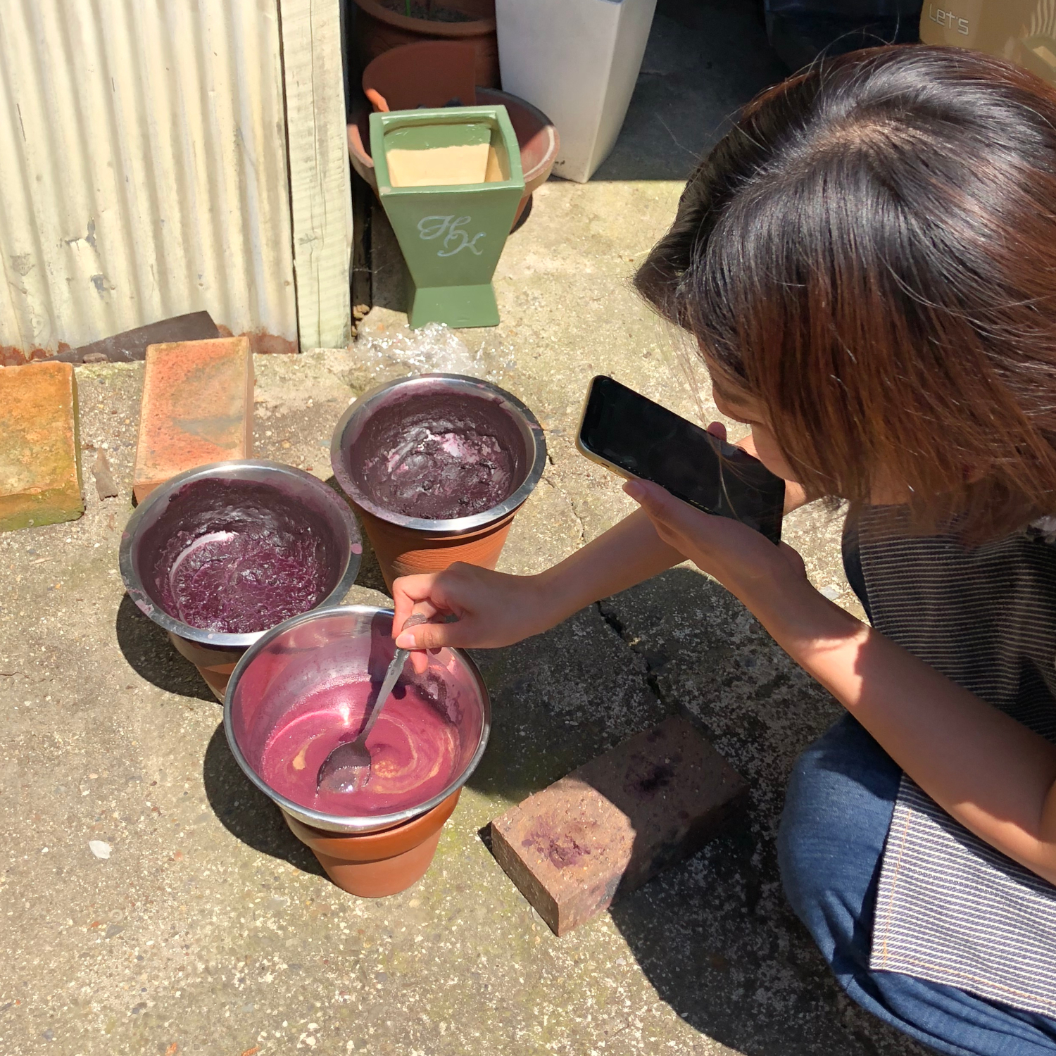 炭酸カリウムとハイドロサルファイトを鍋に入れて加熱します。温度を上げながらアルカリ状態で還元していくと、最初はこんな風な紫暗い色だったのが・・・