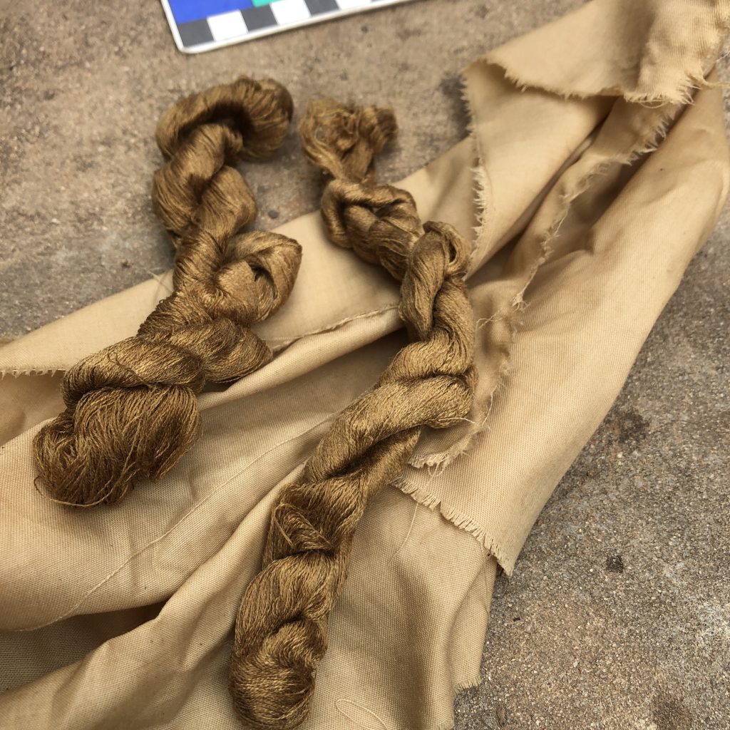 画像のように煮出し液は茶色です。そしてそこに布と絹糸を入れて90℃程度まで染めた後に常温まで冷やして一度取り出してみると、こんなベージュです。これはこれで良き色です。