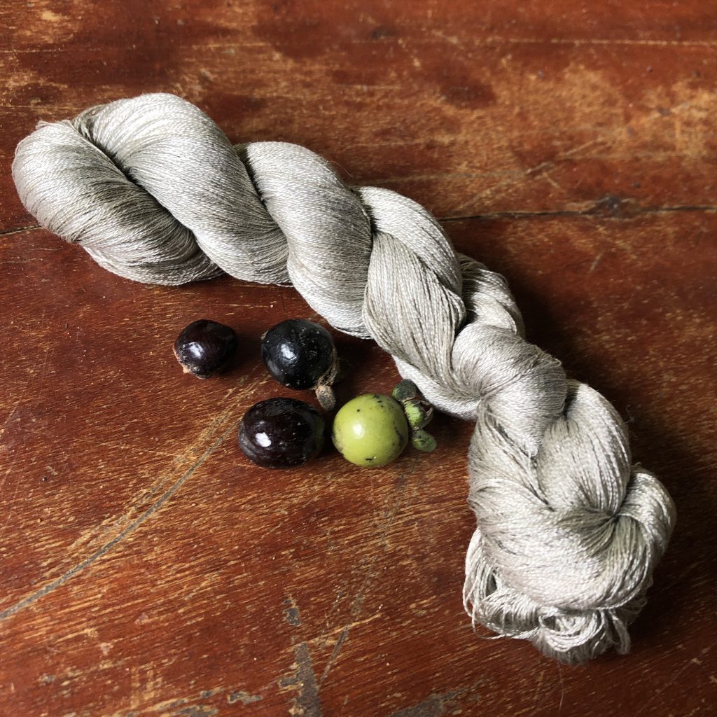 絹糸はもちろん、ポリエステルが少し入っている布もかなり暗いグレーになりました。1回の浸染と媒染だけでこれです。