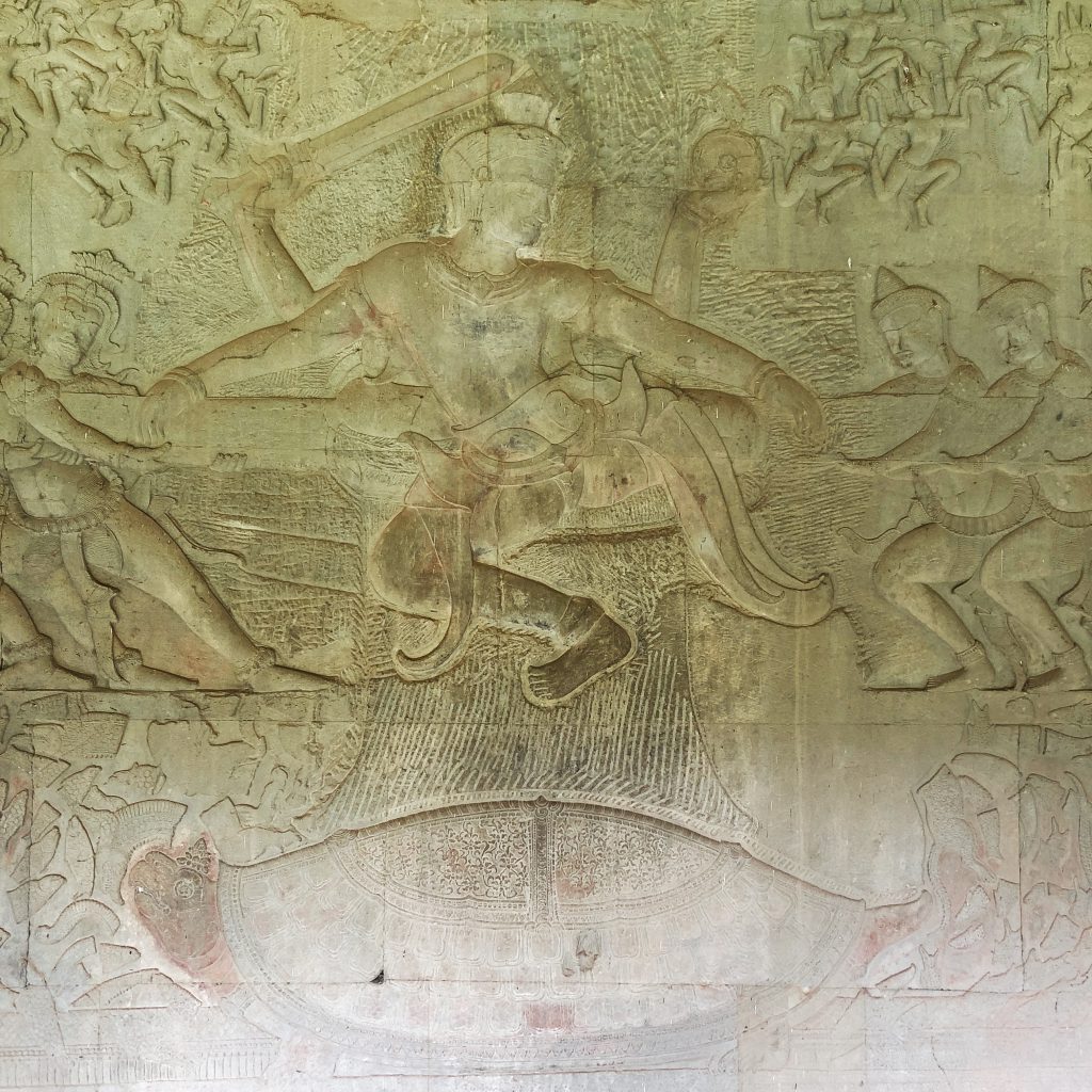 このレリーフの中心がヴィシュヌ、左が神側、右がアスラ側ですね。どちらもヴィシュヌを見ながらヴァースキの胴体を引っ張っています。この神とアスラがこの左右ずっと後ろまで延々とレリーフで描かれており、回廊の壁全体を覆っています。神側にはハヌマーンなどの有名な神様もいました。