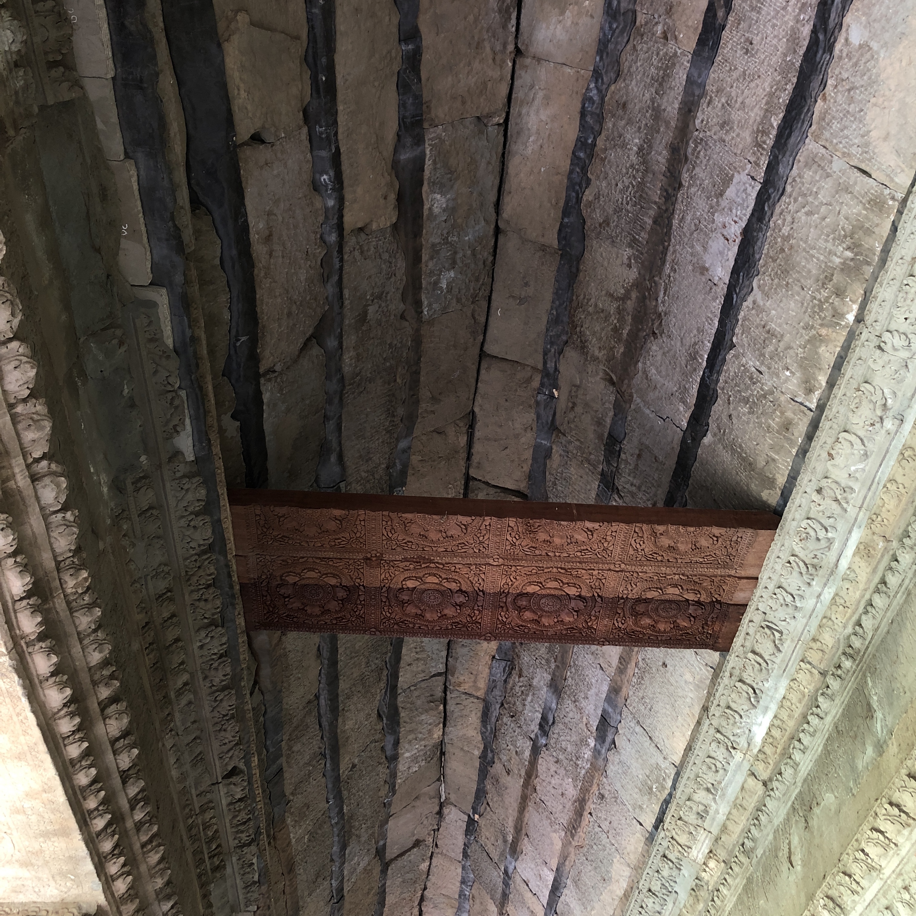 この天井に限らず、木造のものは全く残っていません。高温多湿のカンボジアでは木材が永く形をとどめることが適わず、古来このことを身に染みていたクメール人は、世代を超えて遺すものは例外なく全て石造でした。