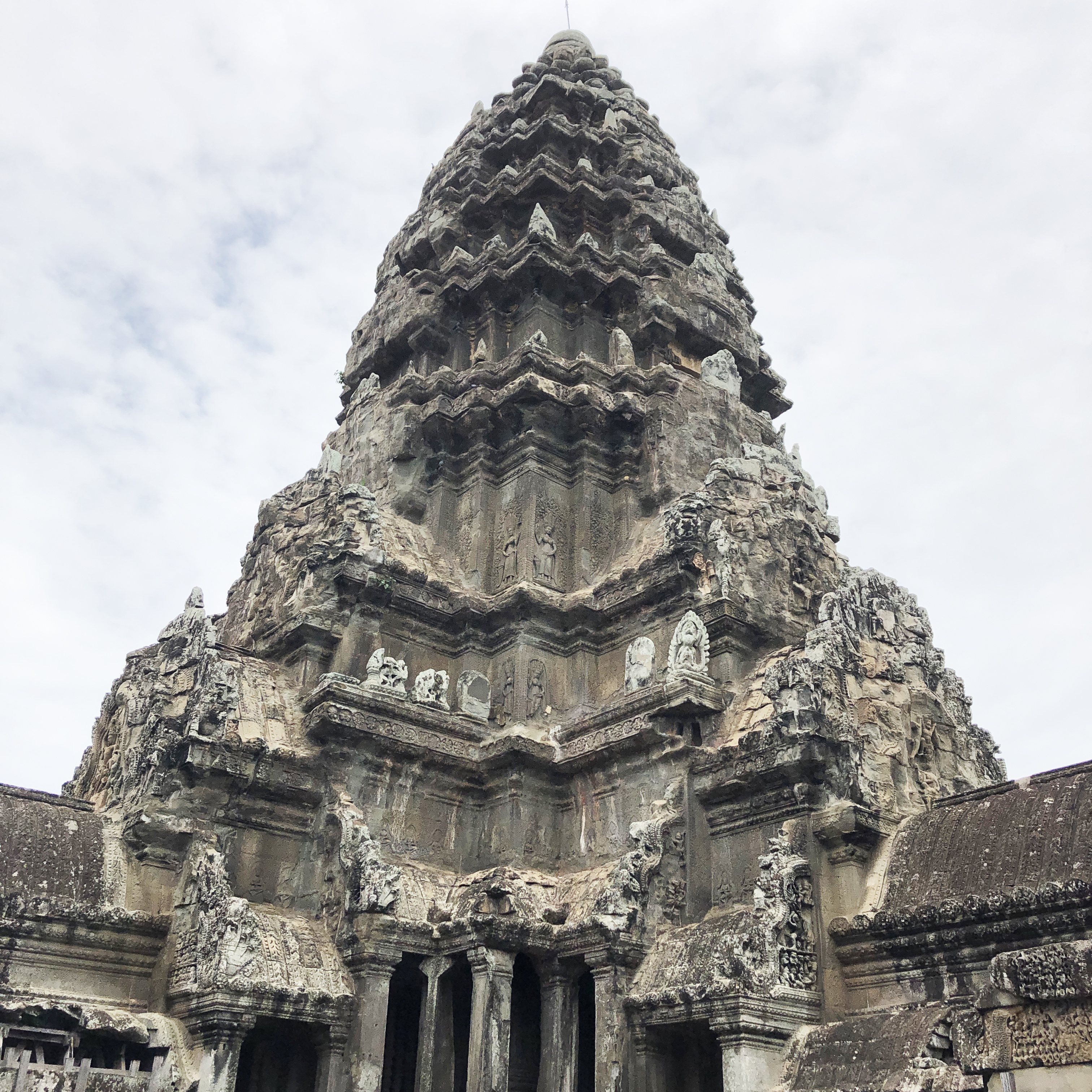 この塔は正方形を成している第三回廊すべての4角、そして中心の計5つそびえています。よくアンコールワットの写真を見るとこのページのトップの画像のように塔が3つですが、それは中心の最も高い塔と2つの角にある塔しか映らないからなのですね。よく見ると、後ろの2画の塔の頭だけが小さく映っている写真もあります。