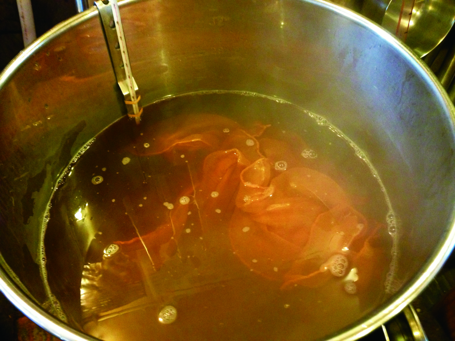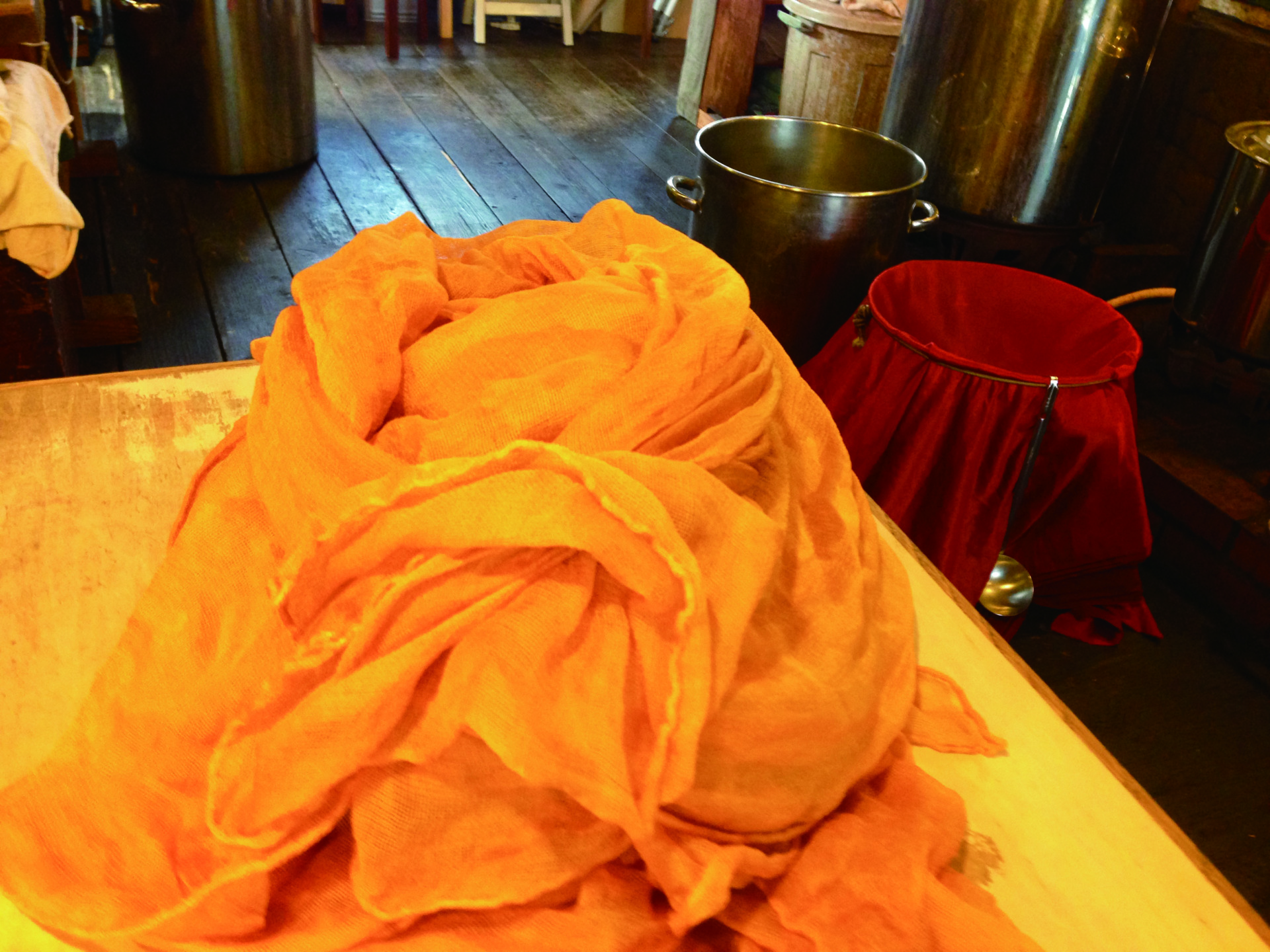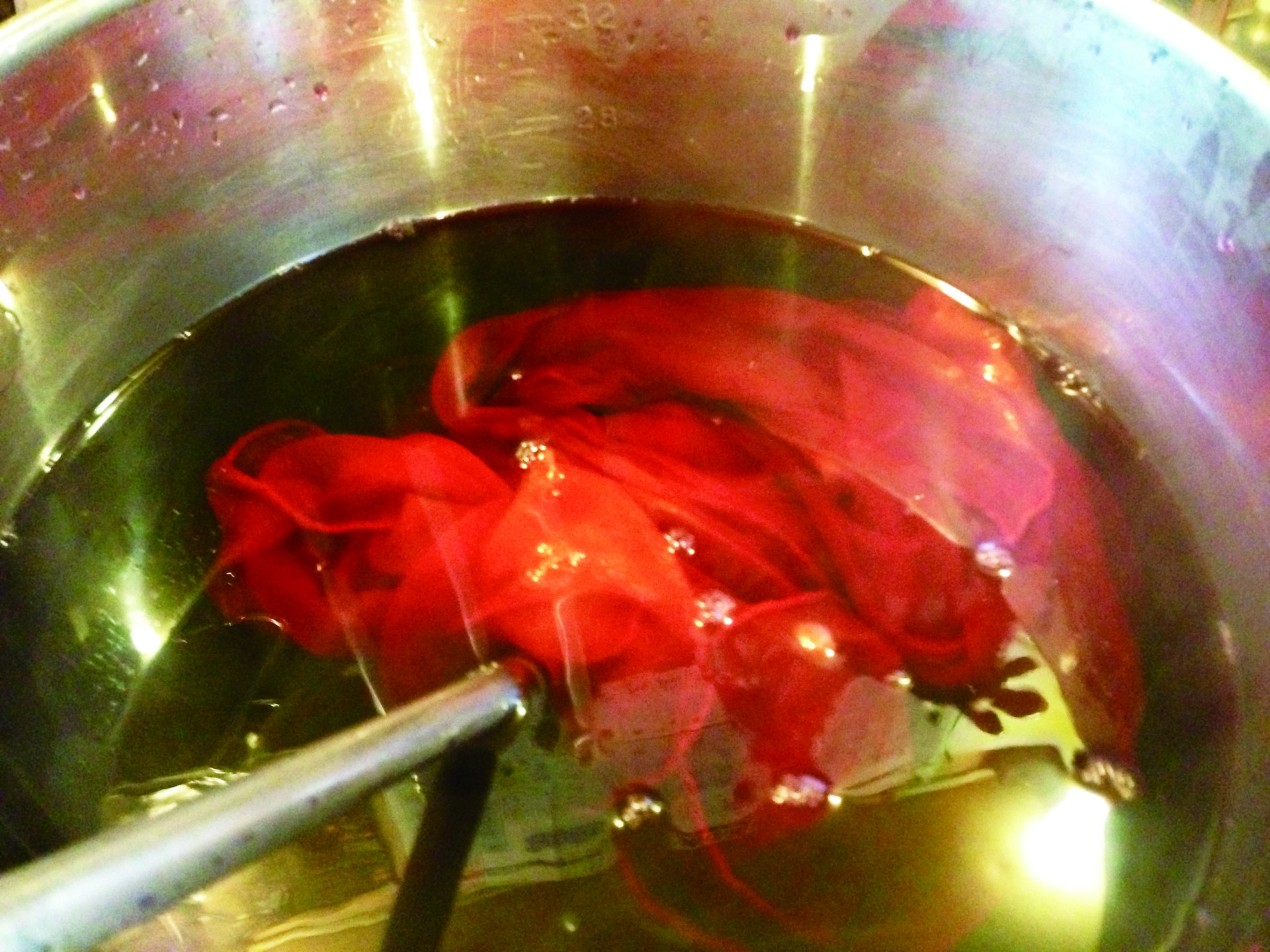 ③スオウの心材を煮込んでスープを作り、そこにハゼで黄色に染まった絹地を入れて染め重ねます。