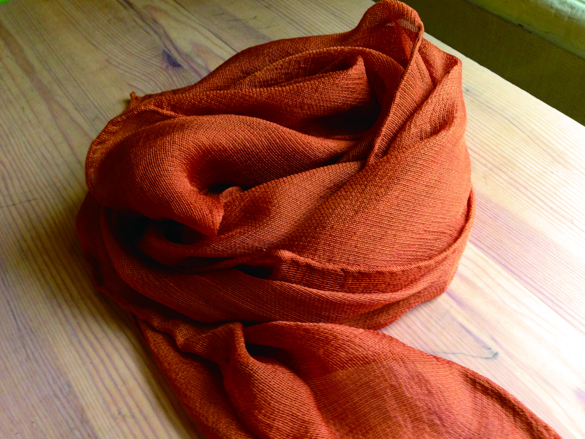 簡単に言えば、ハゼで染めてスオウで染めれば出来上がり、というわけです。ハゼの黄色にスオウの赤が加わって赤茶系の色に仕上がります。ですが、実際には“そうは問屋が卸さない”のです。先ほど “延喜式を参考に”と言いましたが、延喜式に記された本当の黄櫨染は、染め回数も使う植物の分量も、どちらもびっくりするくらい多く、そして、その染め方は謎だらけなのです。