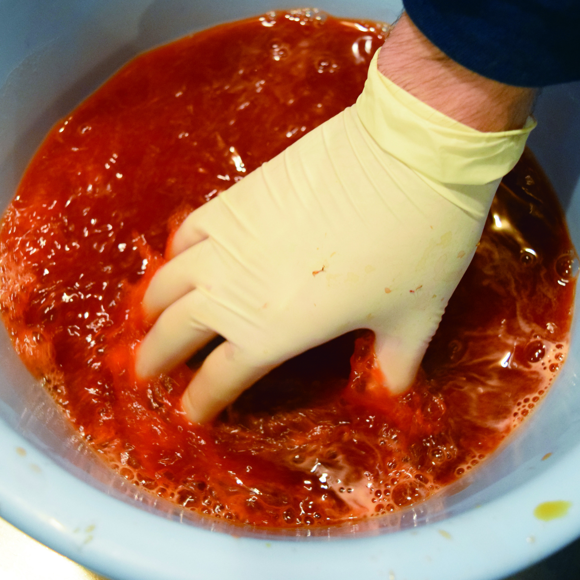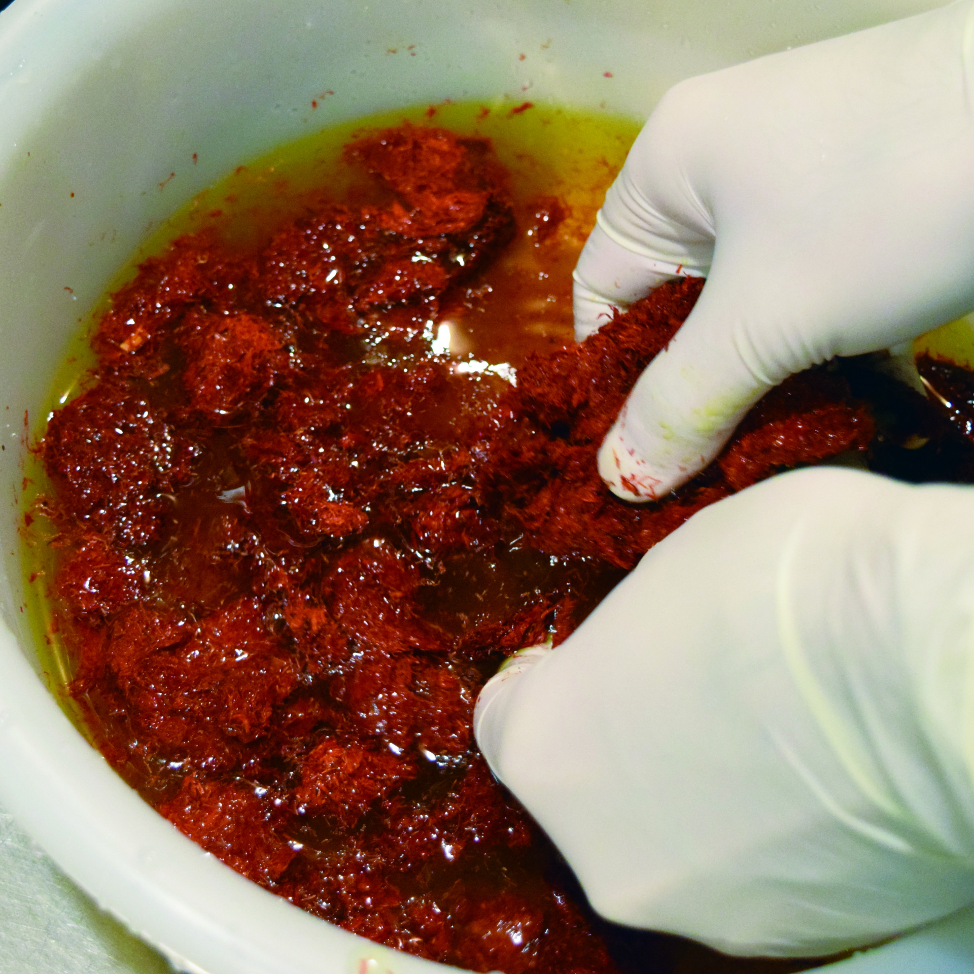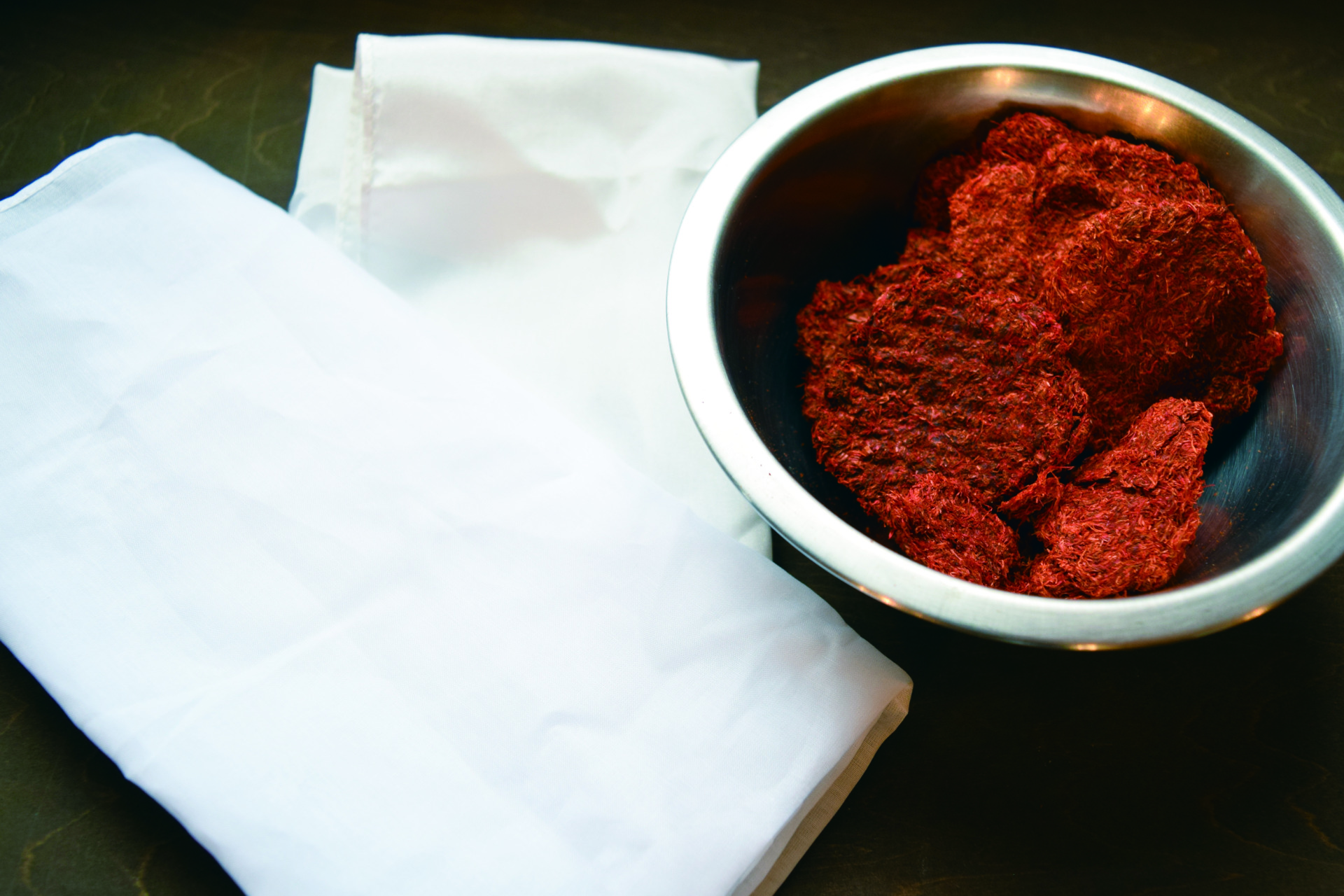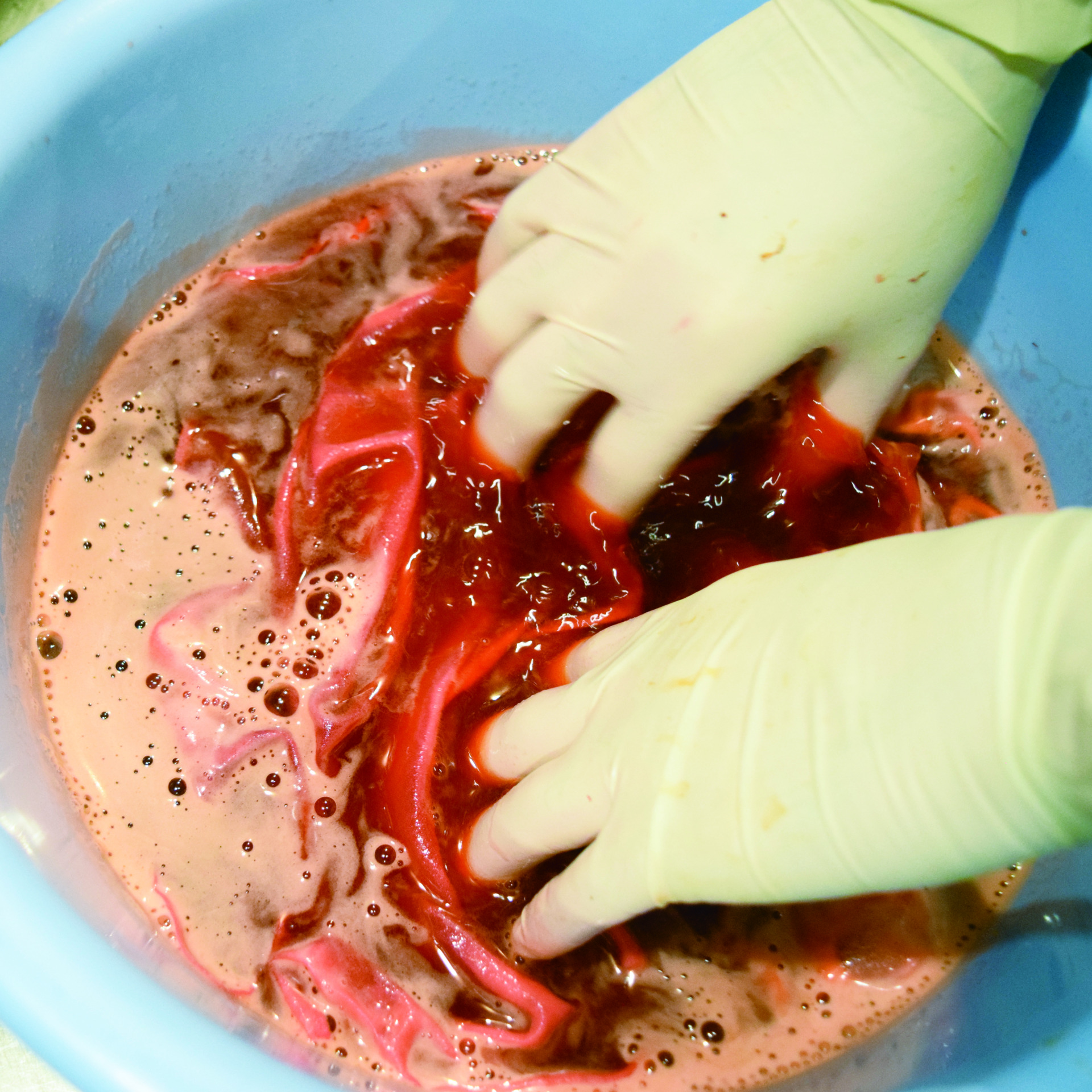 その後、炭酸カリウムを溶かしたアルカリ水に紅餅を浸けて揉み続けます。するとアルカリが好きなカルタミンは液の中に出てきます。まず黄色素を水で洗い落としその後にアルカリ水で赤色素を取り出す、という方法で赤味の強い紅花染を目指します。昔は藁(わら)を燃やした灰を水で溶いた上澄み液「灰汁(あく)」をアルカリ水として使用していました。灰汁の主成分は炭酸カリウム。今回使用しているものと同じ物質です。