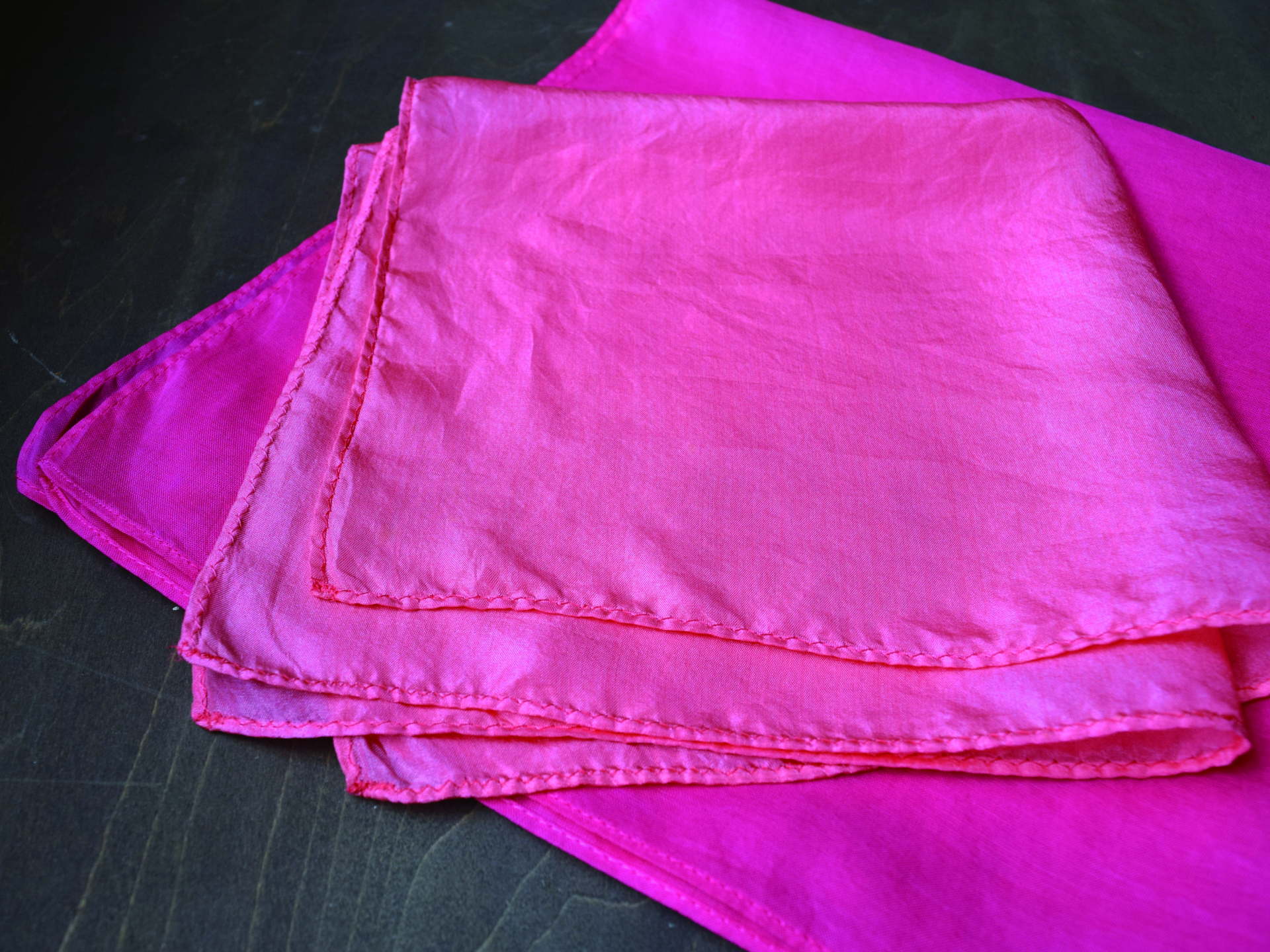 下のハンカチがコットンで、上のハンカチがシルクです。一緒に染めるとコットンは激しいショッキングピンクに、シルクは優しいピンクになります。これは
