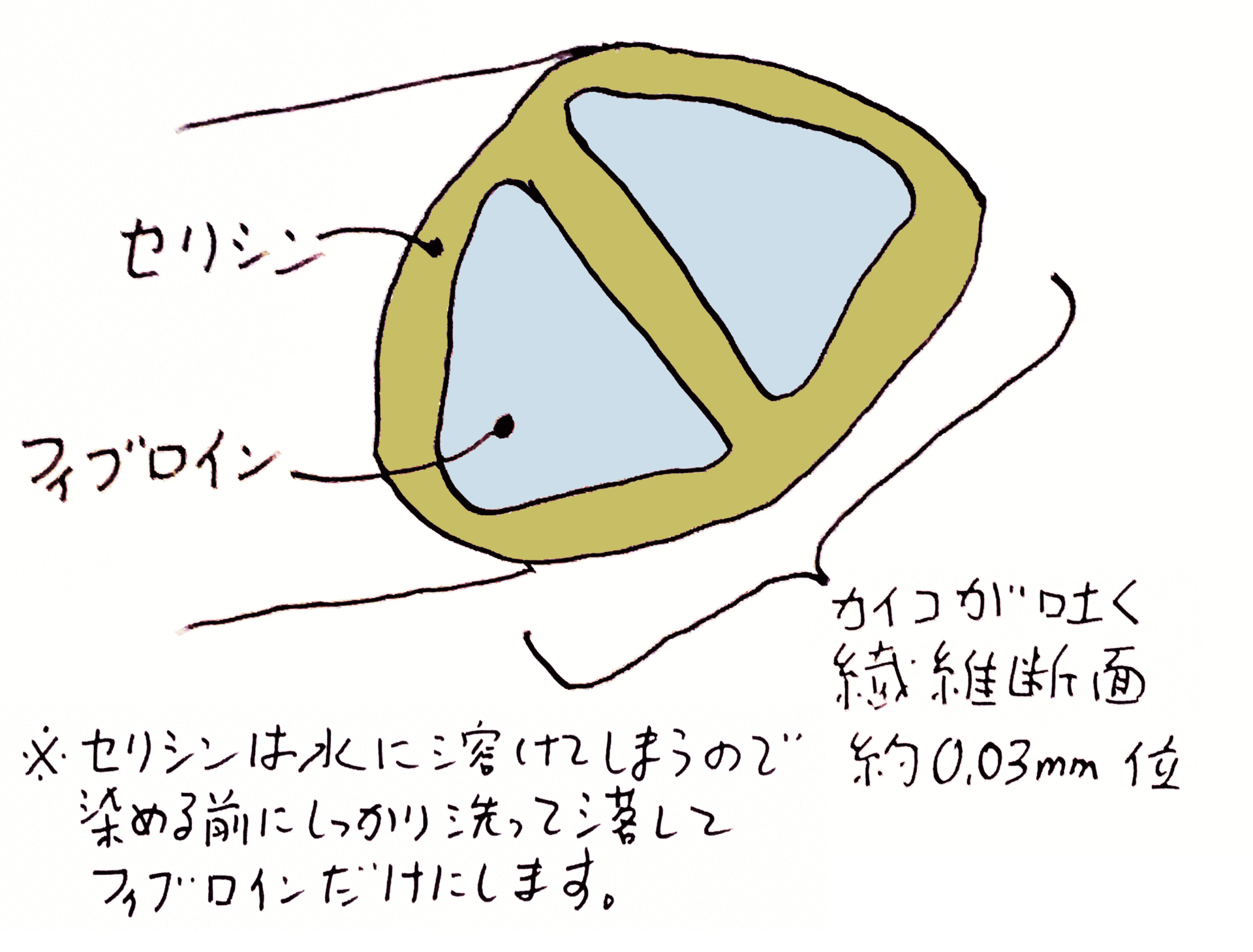 絹の繊維はお蚕さんが口から吐いて(厳密には吐いているわけではなく引き延ばしているのですが)出来上がります。吐かれたばかりの絹の繊維は図のように少々変わった断面をしており、フィブロインという2本のタンパク質を、セリシンというべとべとしたタンパク質が囲んでいます。フィブロインというのはしなやかで強い繊維状タンパク質です。お蚕さんはこの丈夫な材料を体の中にある絹糸腺で大量に作り繭の壁を築いて、4~5日間の蛹時代をやり過ごすわけですね(その前に私たち人間が彼らを殺めてその壁をいただいてしまうのですが)。この丈夫なフィブロイン繊維は断面が三角形なのです。